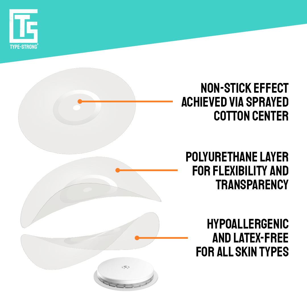 These adhesive patches are made from 95% cotton and 5% spandex. This results in patches that are super comfortable and move with your body - so comfortable you'll forget you're even wearing them!